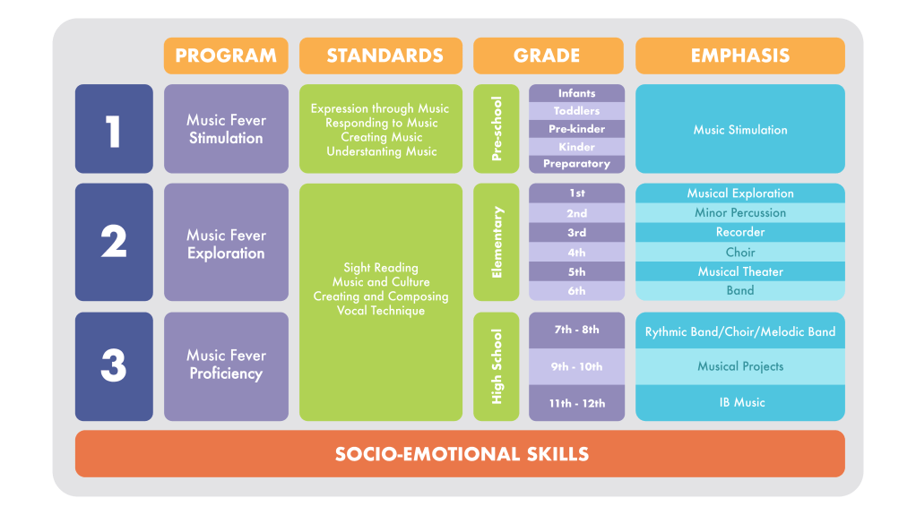- Music Fever Proficiency: Es la etapa donde los estudiantes, tras completar las fases de estimulación y exploración, comienzan a especializarse en un área específica de la música. Este programa también prepara a los estudiantes para el programa de Música del Bachillerato Internacional (MYP).